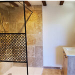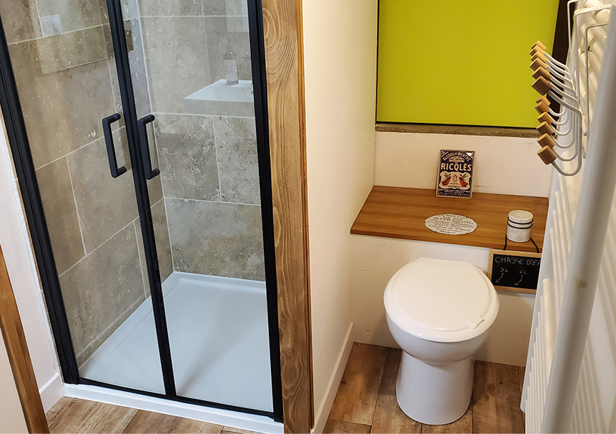 Les entrées du gîte sont situées sous un préau qui couvre une grande terrasse de 38m2, qui permet de se poser en extérieur, à l’abri de la pluie ou du soleil. La terrasse reste encore à aménager.